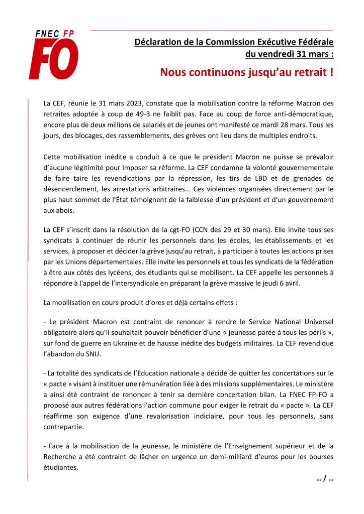 Déclaration de la FNEC FP-FO au CSA D de Gironde, 21 mars 2025